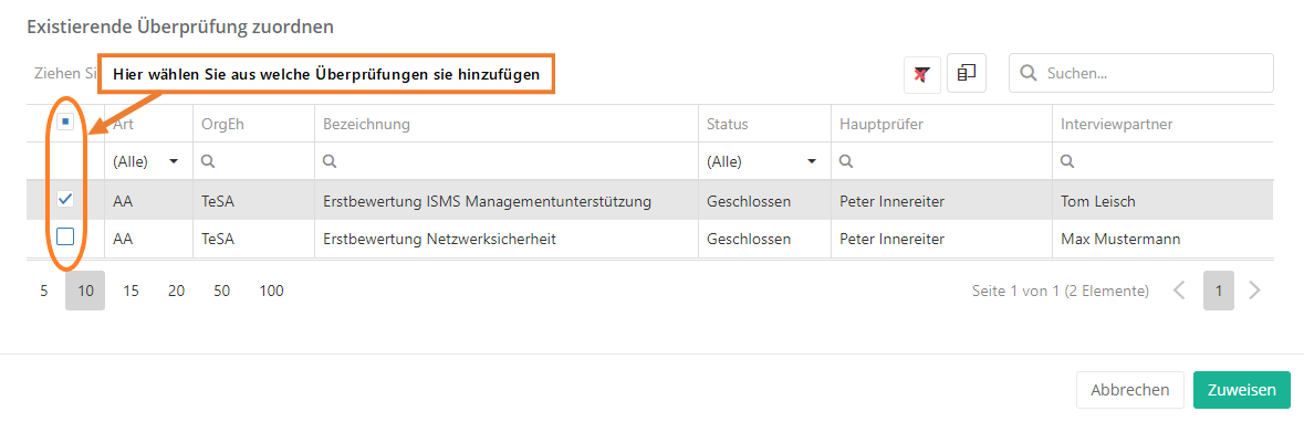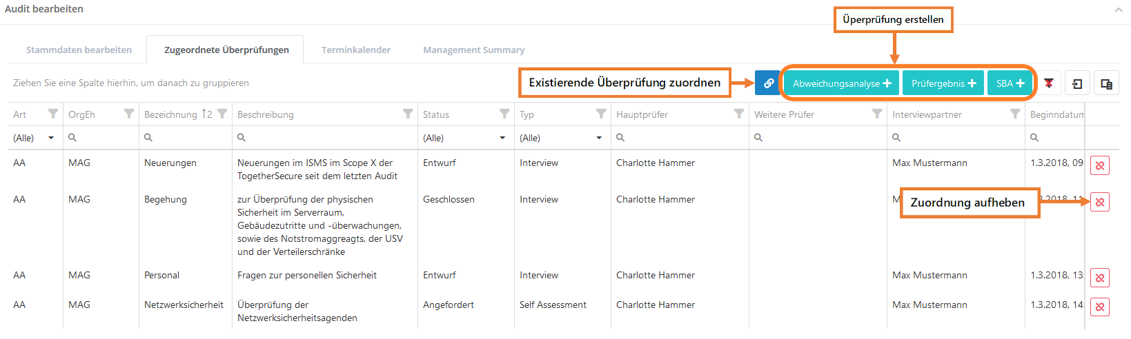 Furthermore, it is possible to create new reviews/analyses for an audit here. It is also possible to assign existing reviews/analyses to the audit.
