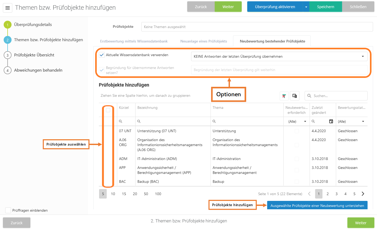 In diesem Punkt fügen Sie oder der Hauptprüfer die Prüfobjekte hinzu welche in der Überprüfung behandelt werden sollen.
