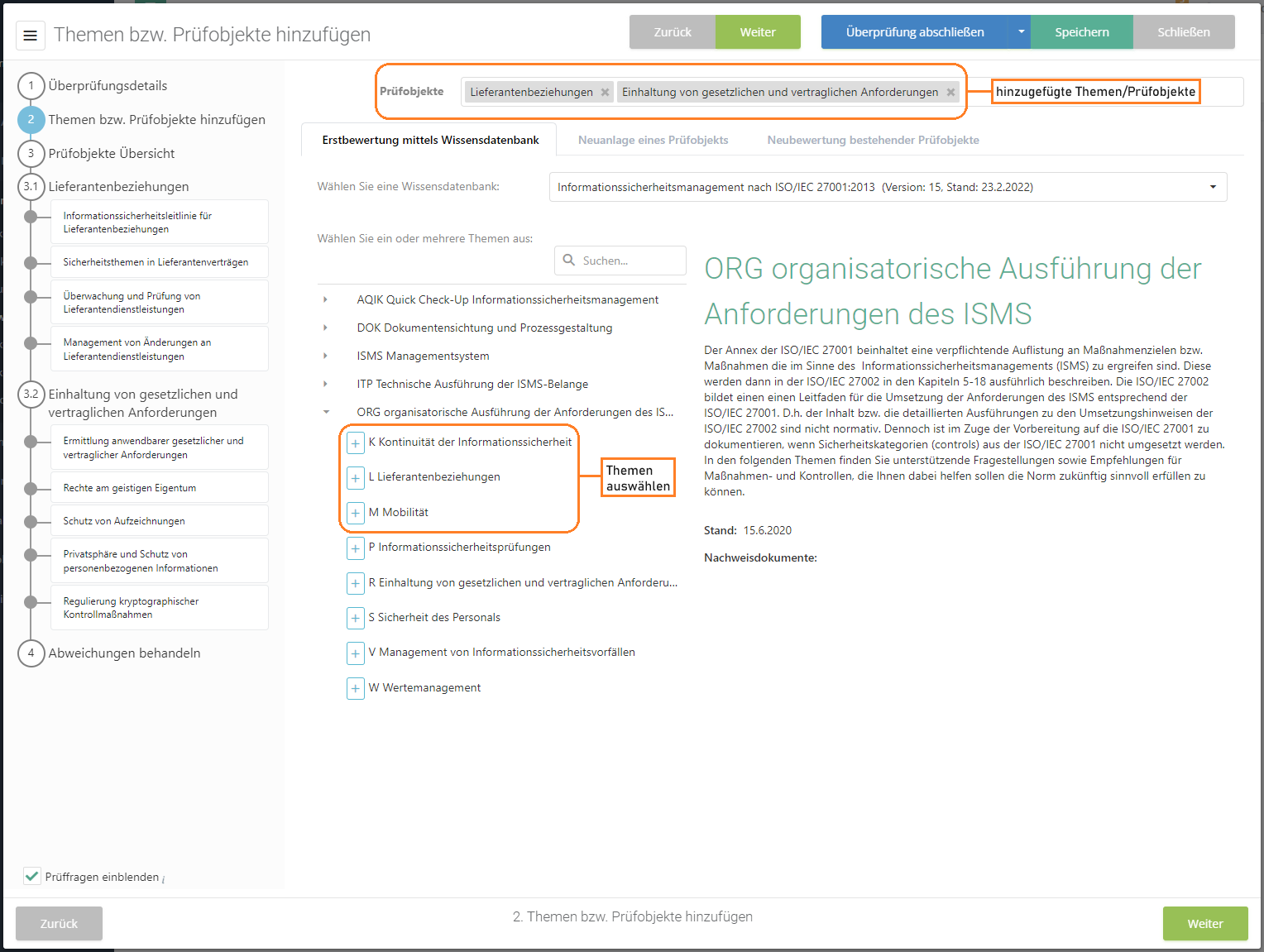 Hierfür wählen Sie zuerst die gewünschte Wissensdatenbank über das Dropdown im Tab "Erstbewertung mittels Wissensdatenbank". Danach wählen Sie alle Themen aus, welche zum ersten Mal im Kontext einer Überprüfung behandelt werden.