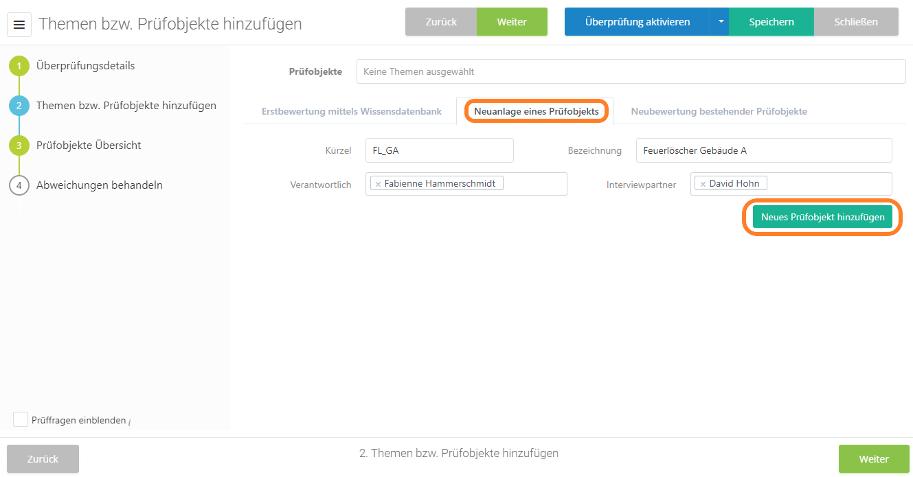 Dafür müssen für das neue Prüfobjekt eine Bezeichnung sowie ein Verantwortlicher vergeben werden. Wurde dies erledigt, muss auf "Neues Prüfobjekt hinzufügen" geklickt werden.