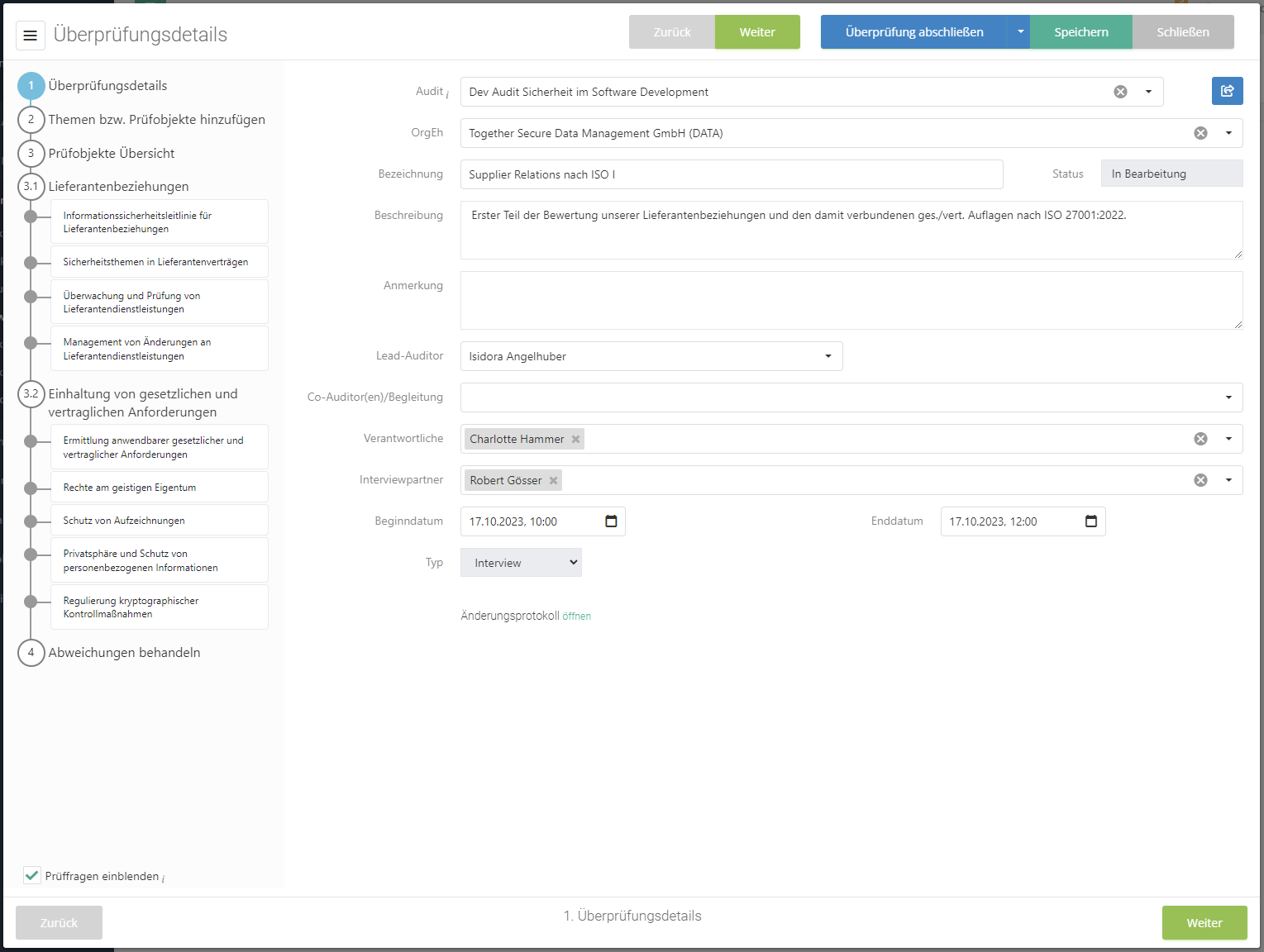 - Hier wird der Hauptverantwortliche einer Überprüfung festgelegt. Er/Sie wählt die Themenbereiche der Überprüfung aus, bestimmt weitere Auditoren, sowie Interviewpartner und fordert Beantwortungen von diesen an.
