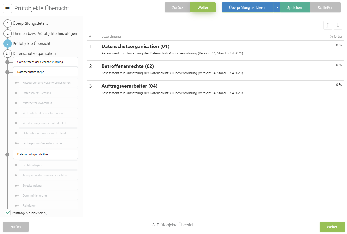 Hier werden alle Prüfobjekte welche der Überprüfung hinzugefügt wurden angeführt. Markiert man ein Prüfobjekt in der Übersicht mit einem einfachen Klick, kann man mitden Pfeilen rechts oben das Prüfobjekt in der Reihenfolge verschieben. Speichern überträgt die neue Reihenfolge auch in den Balken links. Durch Klicken auf "Weiter" wird man in die Übersicht der einzelnen Prüfobjekte weitergeleitet, in der alle zugeordneten Prüffragen und Prüfergebnisse der Prüfobjekte gelistet werden.