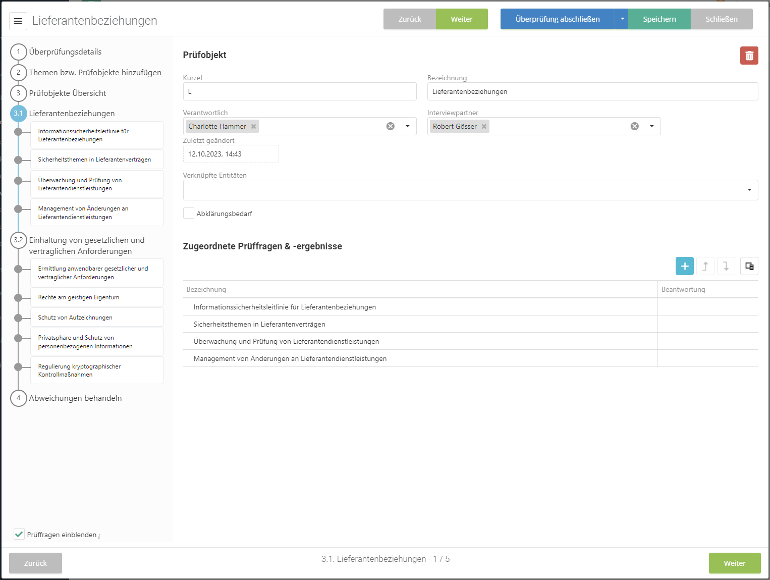 - Mit ihnen werden im Verlauf einer Überprüfung Interviews über die Themen geführt. Im Zuge eines Self Assessments werden sie mit der Beantwortung der Prüffragen beauftragt. (siehe Typ) Der Interviewpartner ist daher ein Pflichtfeld, sobald eine Übeprüfung nicht mehr im Status "Entwurf" ist.