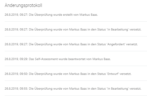 - Hier wird mit aufgezeichnet zu welchen Zeitpunkten die Überprüfung von wem bearbeitet wurde, wann Sie den Status gewechselt hat und wann Sie abgeschlossen wurde.