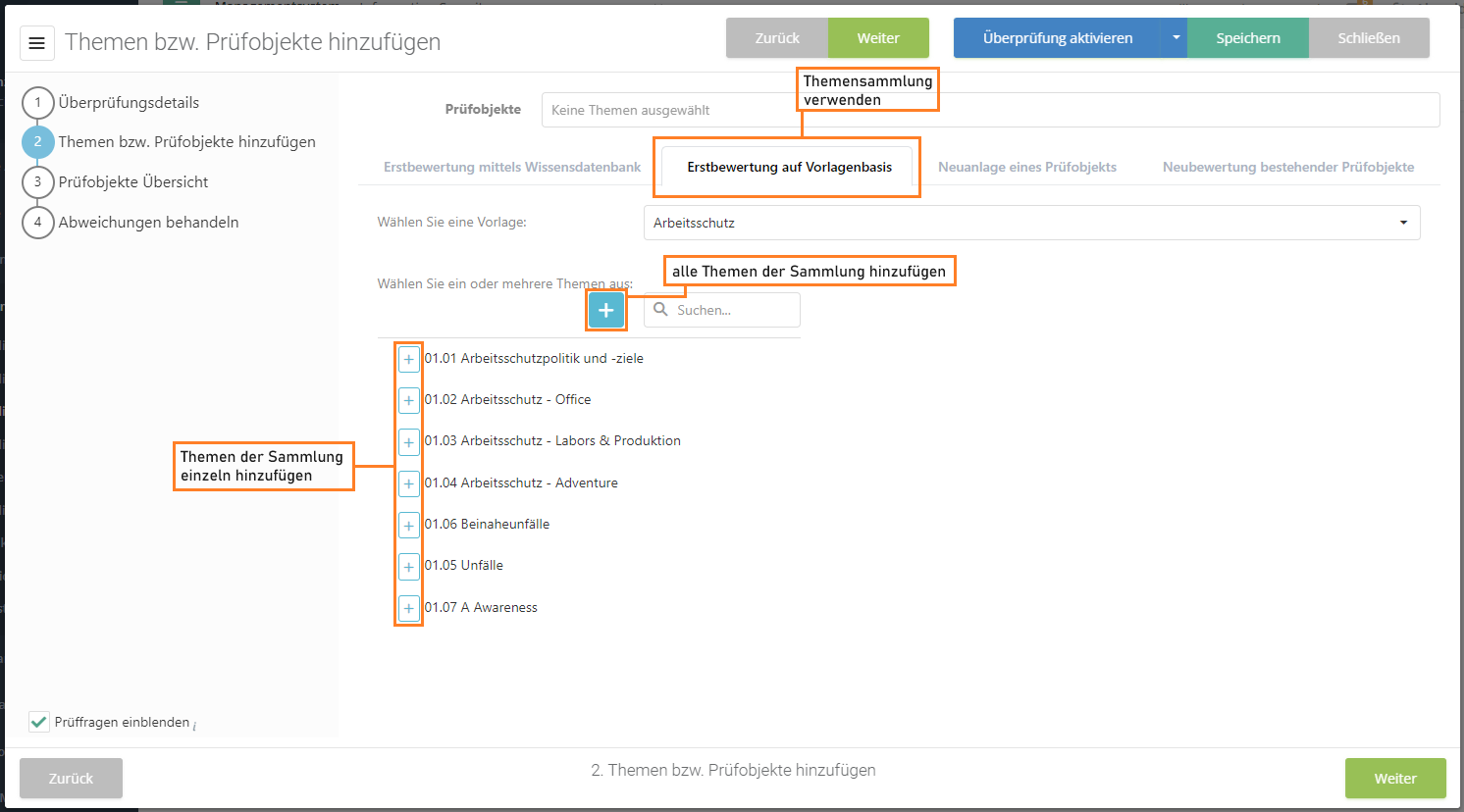 Hierfür wählen Sie zuerst die gewünschte Themensammlung über das Dropdown im Tab "Erstbewertung auf Vorlagenbasis". Danach wählen Sie alle Themen aus, welche zum ersten Mal im Kontext einer Überprüfung behandelt werden.
