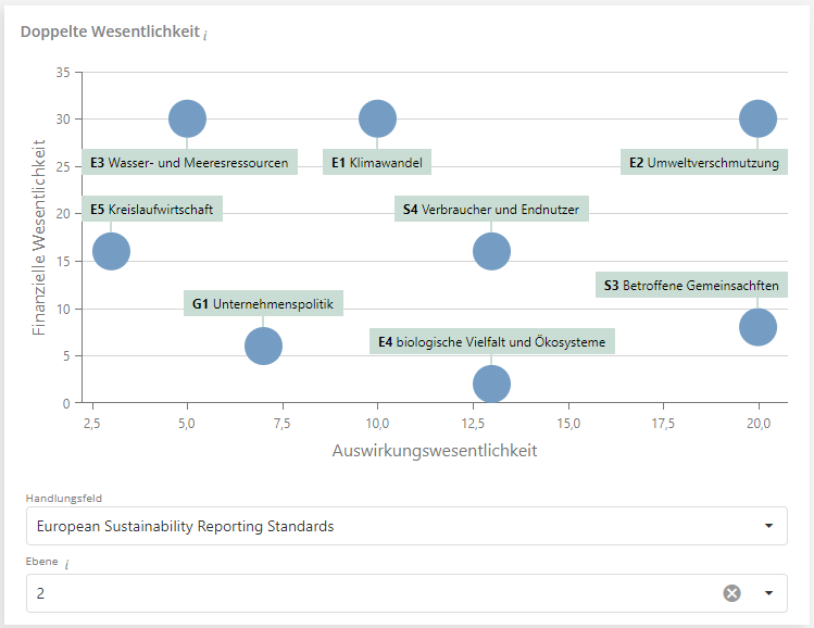 Die Position der Bläschen ergibt sich aus der höchsten, absoluten Risikokennzahl (Chancen und Risiken) auf der Finanziellen Wesentlichkeitsachse und der höchsten, absoluten Auswirkungskennzahl (positive und negative Auswirkungen) auf der Auswirkungswesentlichkeitsachse. (Mehr zur Auswirkungskennzahl finden sie hier.) Ein grau hinterlegtes Feld kann anzeigen, ob ein Handlungsfeld als wesentlich und damit berichtspflichtig gilt (grau = nicht wesentlich). Die Schwellwerte dafür werden in den Einstellungen des Risikomanagements konfiguriert.