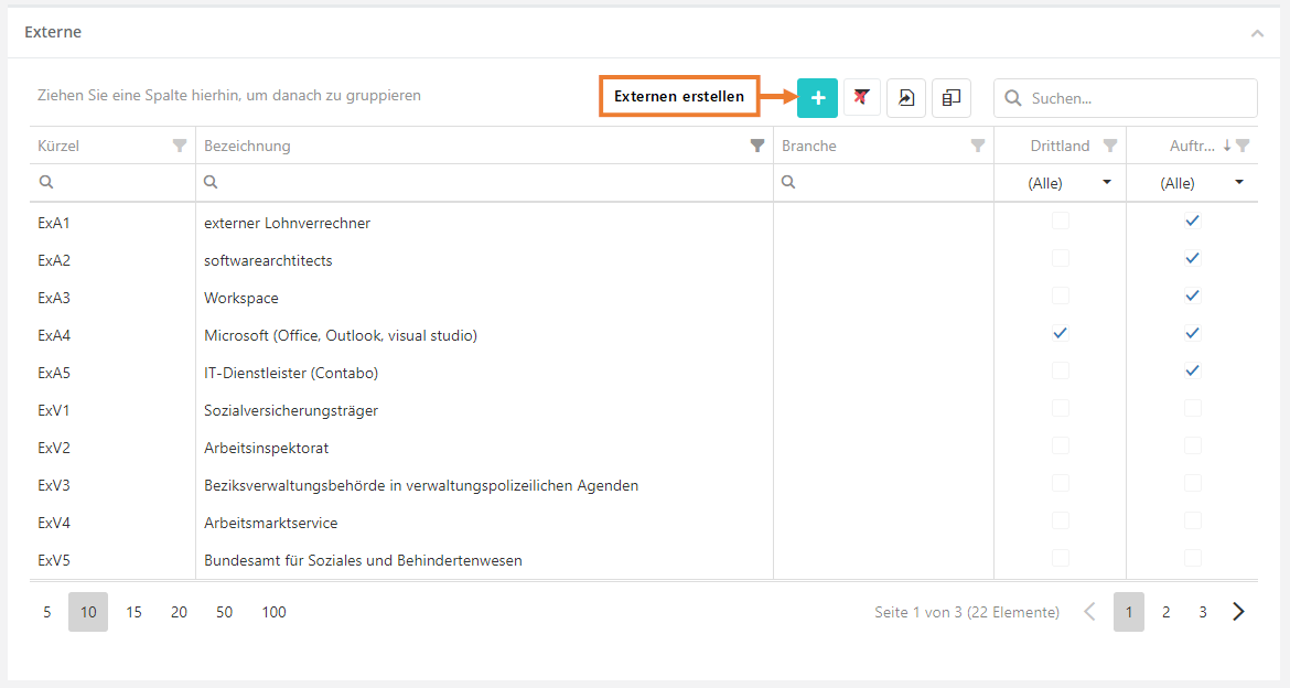 Hier können Sie ebenso neue Externe erfassen oder bereits erstellte bearbeiten.