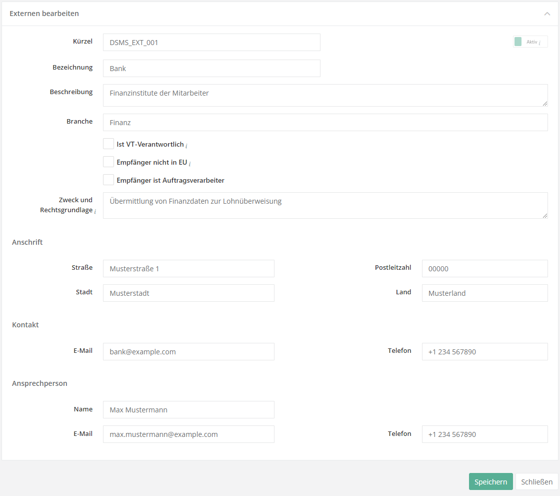Ist VT-Verantwortlich: Muss aktiviert werden, damit der Externe in der Auswahl für VT-Verantwortliche in einer Verarbeitungstätigkeit angezeigt wird.