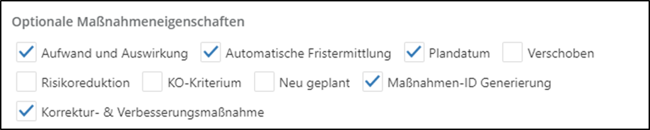 Wenn man generell keine Korrektur- und Verbesserungsmaßnahmenkennzeichnung vornehmen möchte, dann lässt sich dies in der Basiskonfiguration der Anzeigefelder für die Maßnahme zum jeweiligen Managementsystem einstellen. Dazu wechselt man als Expert in die Administration unter Managementsystem, wählt das jeweilige Managementsystem aus und setzt auf dem ersten Tab unter „optionale Maßnahmeneigenschaften“ die jeweilige Einstellung: