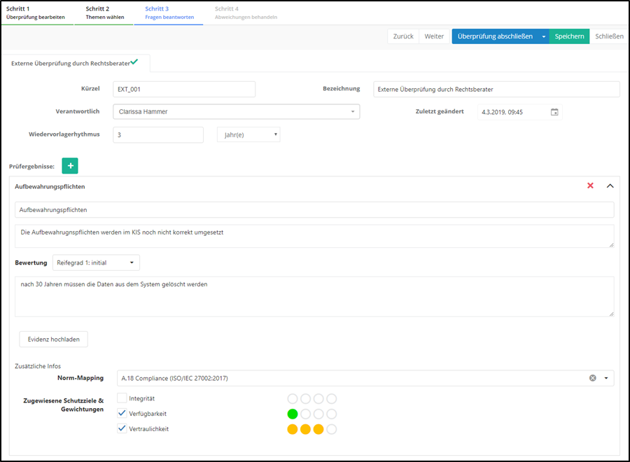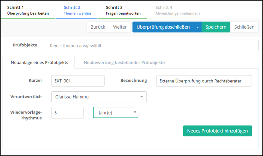 Dazu werden im Schritt 2 Prüfgegenstände zur Beschreibung des besprochenen Themas frei erfasst. Im Schritt 3 können dann beliebig viele Prüfergebnisse zu diesem Prüfgegenstand angelegt werden: