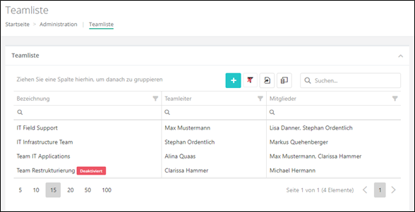 Hier können Teams definiert werden, Teamleiter und -mitglieder bearbeitet werden und diese, wenn gewünscht, auch wieder deaktiviert werden.