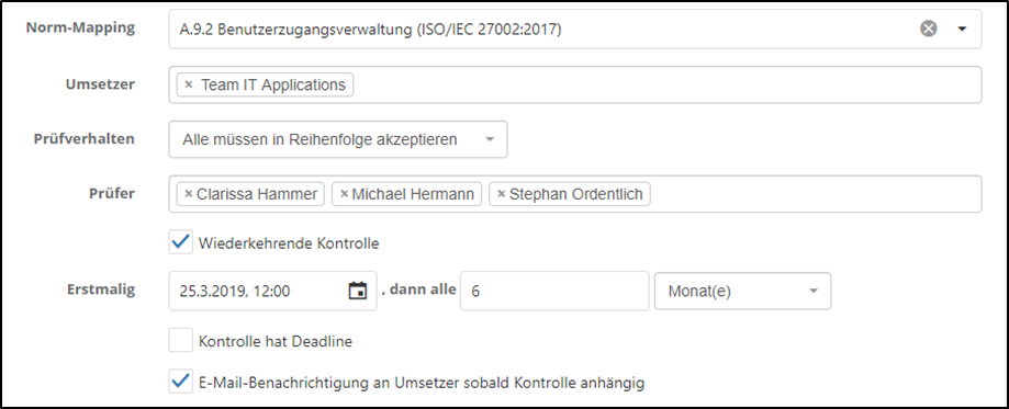 Für Kontrollen gibt es nun die Möglichkeit, diese von mehreren Prüfern in einer definierten Reihenfolge prüfen zu lassen. Dazu ist das Prüfverhalten „Alle müssen in Reihenfolge akzeptieren“ auszuwählen. Dann sind die Prüfer, in der Reihe ihrer Prüfhandlungen, einzutragen: