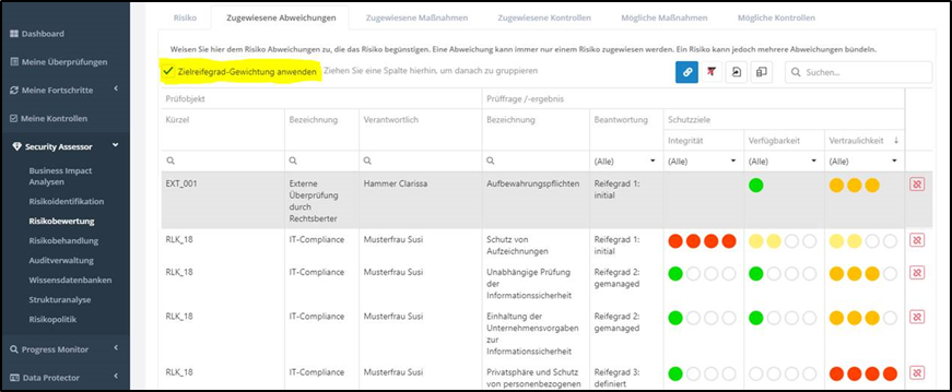 Bisher war es möglich in allen Abweichungsauflistungen diese nach der Gewichtung ihrer Schutzziele zu sortieren. Nun kann die Gewichtung der Schutzziele mit der Differenz der Abweichung zum Zielreifegrad in Beziehung gesetzt werden. Daher gibt es nun die Option der „Zielreifegrad-Gewichtung“ für Sortierungen.