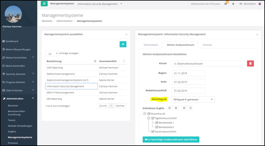 Der Zielreifegrad je Managementsystem und Analysezeitraum ist unter „Administration“ > „Managementsystem“ > ein Managementsystem selektieren > auf den Reiter „Aktiver Analysezeitraum“ wechseln > 5. Eingabefeld von Oben „Zielreifegrad“ definierbar.