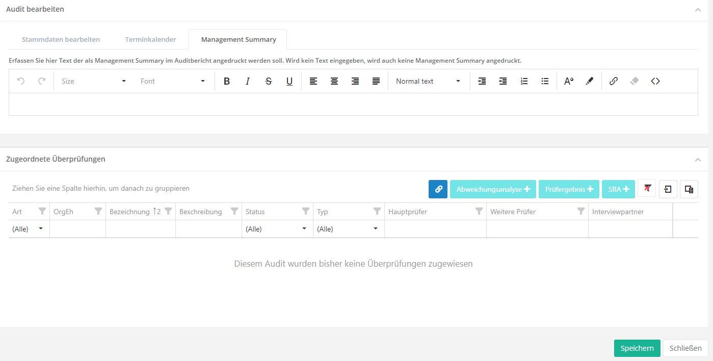 So wie bereits der Terminplaner mit Kalenderansicht in einer der letzten Versionen in HITGuard für die Auditverwaltung ergänzt wurde, kann nun auf einem dritten gesonderten Tab die Management Summary zum Audit erfasst werden. Diese wird auch im Auditplan Bericht mit angedruckt. Um diese Funktion zu nutzen wechseln Sie zu Risikomanagement > Auditverwaltung > Audit und dort auf den 3. Tab Management Summary: