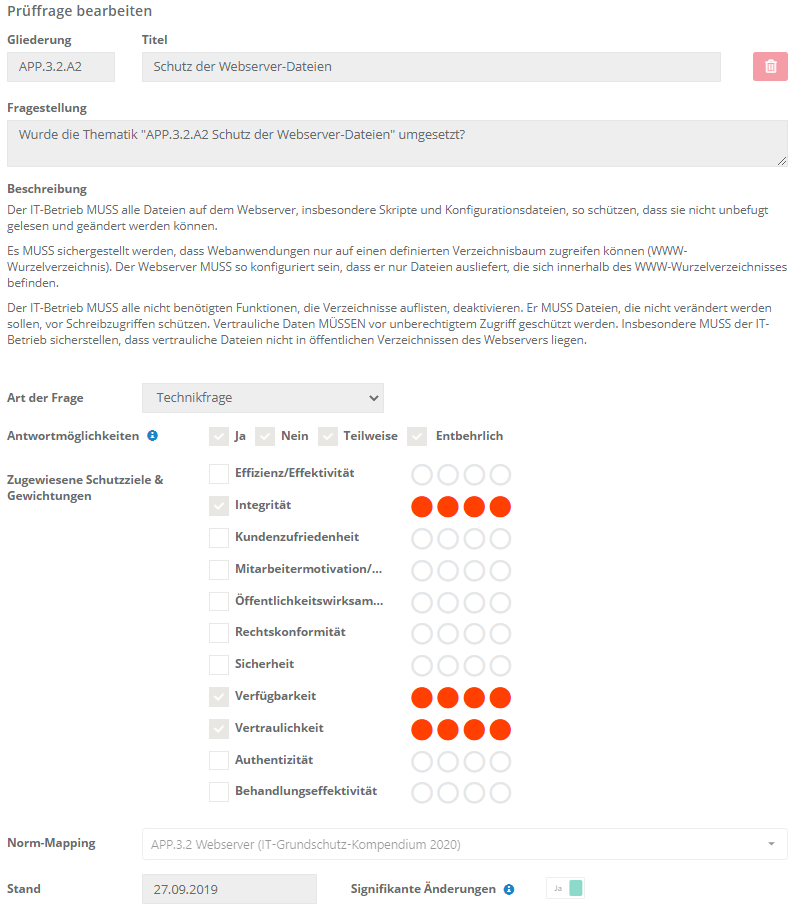 Wird der Schalter nicht auf „Ja“ gesetzt, aber die Prüffrage im Titel, der Fragestellung, der Beschreibung oder bei den Antwortmöglichkeiten geändert, so wird beim Speichern ein Dialog angezeigt, der abfragt, ob man signifikante Änderungen vorgenommen hat. So soll vermieden werden, dass das Setzen des Schalters vergessen wird.