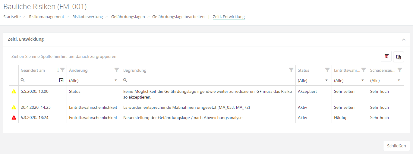 Die Entwicklung der Risikobewertung einer Gefährdungslage wird in dieser HITGuard Version erstmals angeboten und soll hinsichtlich Detailgrad der Informationserfassung und Auswertungsmöglichkeiten in den kommenden Versionen weiter ausgebaut werden. Neu ist, dass eine Änderung des Status, der Eintrittswahrscheinlichkeit oder des Schadensausmaß zu einem verpflichtenden historischen Eintrag mit Begründung führt. Es ist zu dokumentieren weshalb das Risiko zur Gefährdungslage sich erhöht oder gesenkt hat bzw. warum der Status (offen, erledigt, ausgesetzt) der Gefährdungslage gewechselt hat. Die daraus entstandene Historie ist im Menüpunkt „Zeitl. Entwicklung“ zur Gefährdungslage jederzeit abrufbar:
