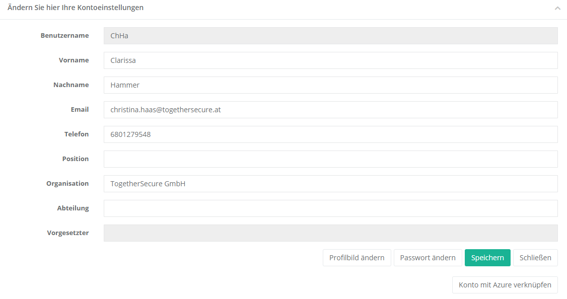 Wird die AAD-Integration nachträglich aktiviert, müssen bestehende HITGuard Benutzer mit ihrem entsprechenden AAD-Konto verknüpft werden, um sich in weiterer Folge per Single Sign-on mittels AAD anmelden zu können. Klickt ein Benutzer auf „Mit Azure anmelden“ wird geprüft ob ein HITGuard-Konto existiert, das mit dem AAD-Konto des Anwenders verknüpft ist. Ist dies nicht der Fall, wird versucht eine Verknüpfung zu einem bestehenden HITGuard-Konto herzustellen. Hierfür muss der Benutzername des Anwenders in AAD und HITGuard übereinstimmen. Ist dies der Fall wird das HITGuard-Konto dauerhaft mit dem AAD-Konto des Anwenders verknüpft und die automatische Anmeldung abgeschlossen. Stimmt der Benutzername nicht überein, so ist eine automatische Anmeldung über AAD zu diesem Zeitpunkt nicht möglich. Der Anwender muss dann sein HITGuard-Konto manuell mit dem AAD-Konto verknüpfen. Hierfür muss er sich zuerst lokal an HITGuard anmelden. Anschließend wechselt er in sein Profil um dort „Konto mit Azure verknüpfen“ (siehe folgender Screenshot, Button in der rechten unteren Ecke) zu wählen: