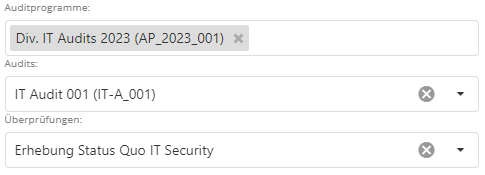 Diese drei neuen Filter erlauben die Einschränkung der Daten im KPI nach verschiedenen Aspekten des Auditmanagements: einem oder mehreren Auditprogrammen und/oder einem oder mehreren Audits und/oder einer oder mehrerer Überprüfungen.