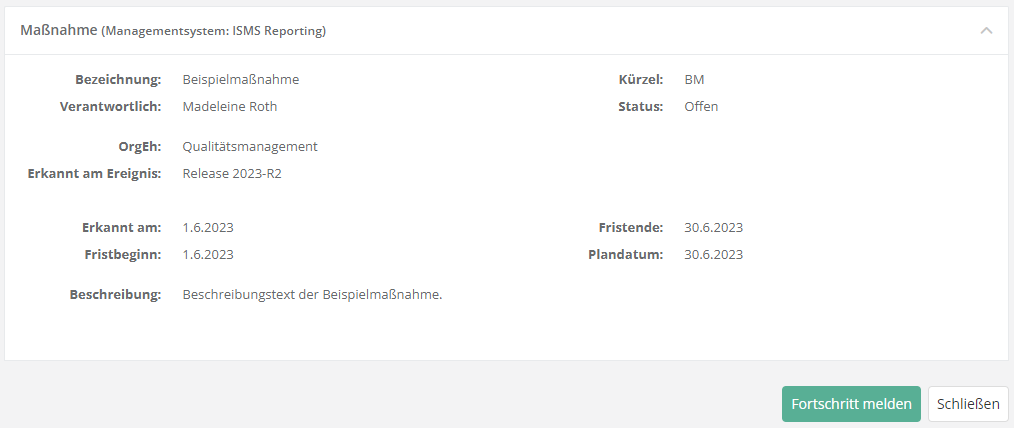 Klickt man doppelt auf eine Maßnahme, öffnet sich die gewohnte schreibgeschützte Ansicht mit allen Informationen, die man als Umsetzer benötigt. Neu ist, dass direkt in dieser Ansicht ein Button zur Verfügung gestellt wird, um den Fortschritt proaktiv melden zu können.