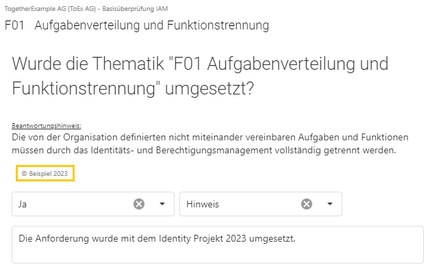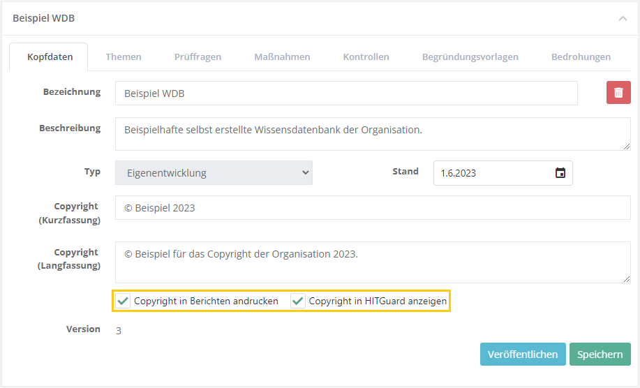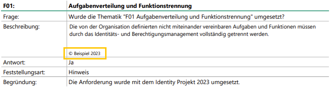 Abonnierte Wissensdatenbanken sind mit einem Copyright Text versehen; bei selbst erstellten Wissensdatenbanken kann dieser optional ergänzt werden. Die kurze Version dieses Texts kann nun sowohl im Überprüfungsassistenten angezeigt wie auch in Berichten bei der Beschreibung der Prüffrage angedruckt werden.