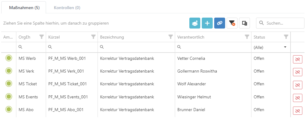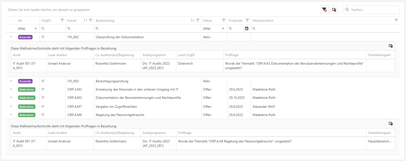 Hier findet sich nun die Maßnahmenübersicht, die zuvor als Teil der Auditdurchführung angeboten wurde. Auf dieser neuen Seite erhält man nun eine erweiterte, kombinierte Übersicht aller Maßnahmen und Kontrollen, die im Zuge von Überprüfungen erstellt oder verknüpft wurden.