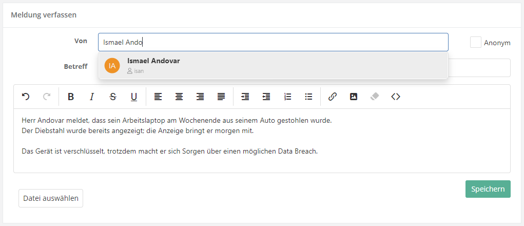 Im Von-Feld kann auch ein Freitext statt dem Namen eines Users eingegeben werden. Dies ist nützlich, wenn der Melder keinen Zugang zu HITGuard hat, oder um bspw. anonyme Meldungen aus einem physischen Postkasten oder CERT-Meldungen im Tool aufzunehmen. Zusätzlich gibt es dann auch die Möglichkeit der Erfassung von Kontaktdaten.