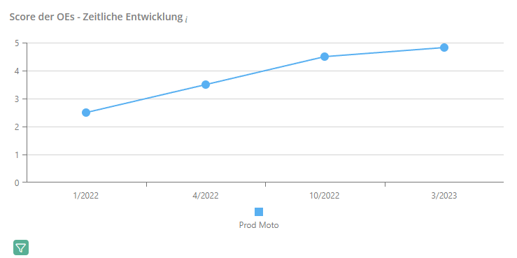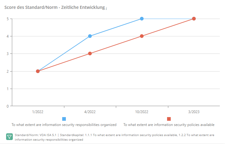 Dieses KPI zeigt die zeitliche Entwicklung des durchschnittlichen Scores aus Überprüfungen von Standards oder Normen. Man kann damit erkennen, ob sich die Compliance mit einem Standard/einer Norm oder auch einzelnen Kapiteln daraus verbessert oder verschlechtert hat. Das KPI kann als Punkte- oder Liniendiagramm dargestellt werden.