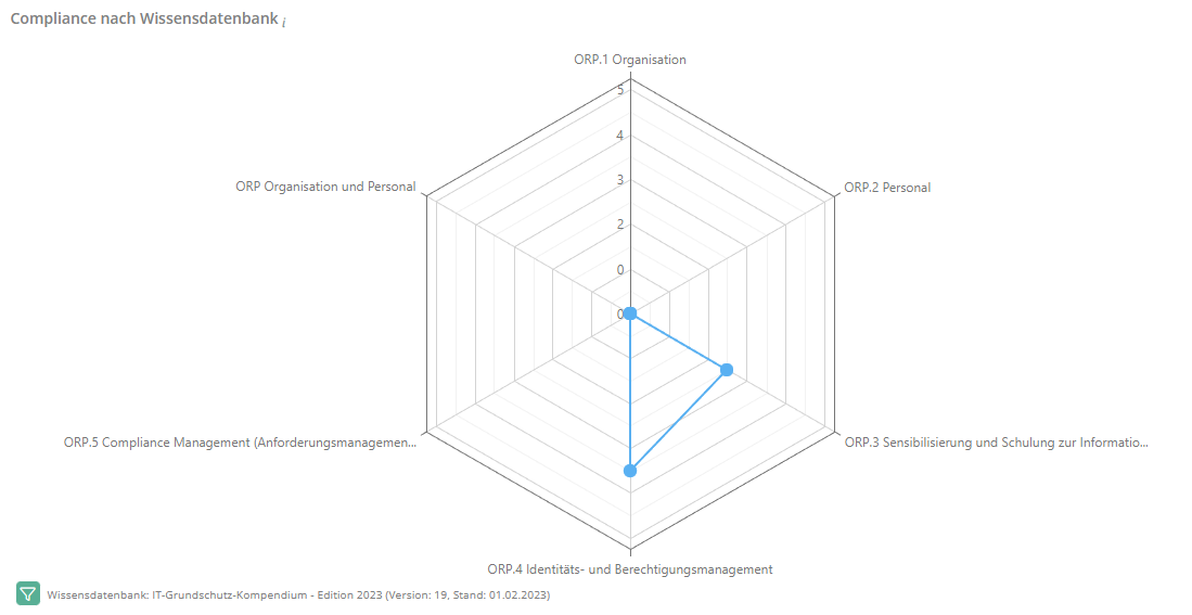 Als Pendant zum bekannten KPI Compliance Erfüllung wurde ein Spinnendiagramm für die Auswertung der Compliance nach Wissensdatenbank statt einem Standard/einer Norm geschaffen. Die Spitzen des Diagramms stellen den erreichten Score für jedes WDB-Thema dar.