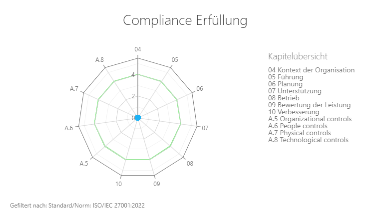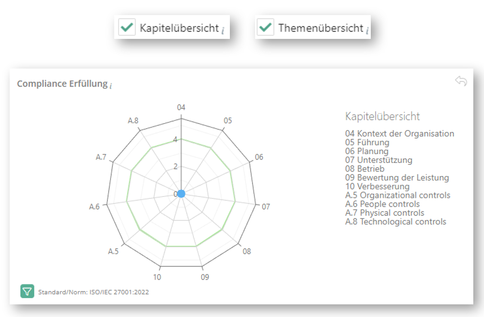 Für Spinnendiagramme (Compliance Erfüllung, Compliance Erfüllung nach Wissensdatenbank, Fragen Deckung Total und Prozentuell) kann optional eine Übersicht der Kapitel (für Standards/Normen) oder Themen (Wissensdatenbanken) eingeblendet werden, die in der aktuellen Ansicht enthalten sind.