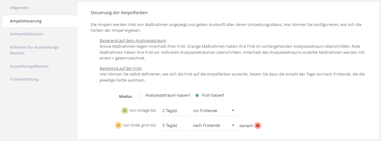 Die Ampel, die in Übersichten den Status einer Maßnahme mit den Farben grün, gelb und rot darstellt, kann ab jetzt unter Maßnahmen > Einstellungen > Ampelsteuerung flexibel konfiguriert werden. Analysezeitraum-basiert bleibt das Verhalten unverändert. Neu ist die Frist-basierte Ampelsteuerung, bei der man definieren kann, wie viele Tage vor/nach Fristende sich die Farbe der Ampel ändert.