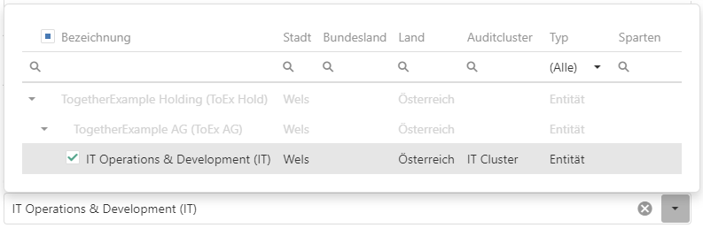 Dieser Filter erlaubt die Einschränkung der Daten im KPI nach einer oder mehreren Organisationseinheit(en). Neu ist dabei, dass auch in diesem Dropdown nach verschiedenen Eigenschaften gesucht und gefiltert werden kann.
