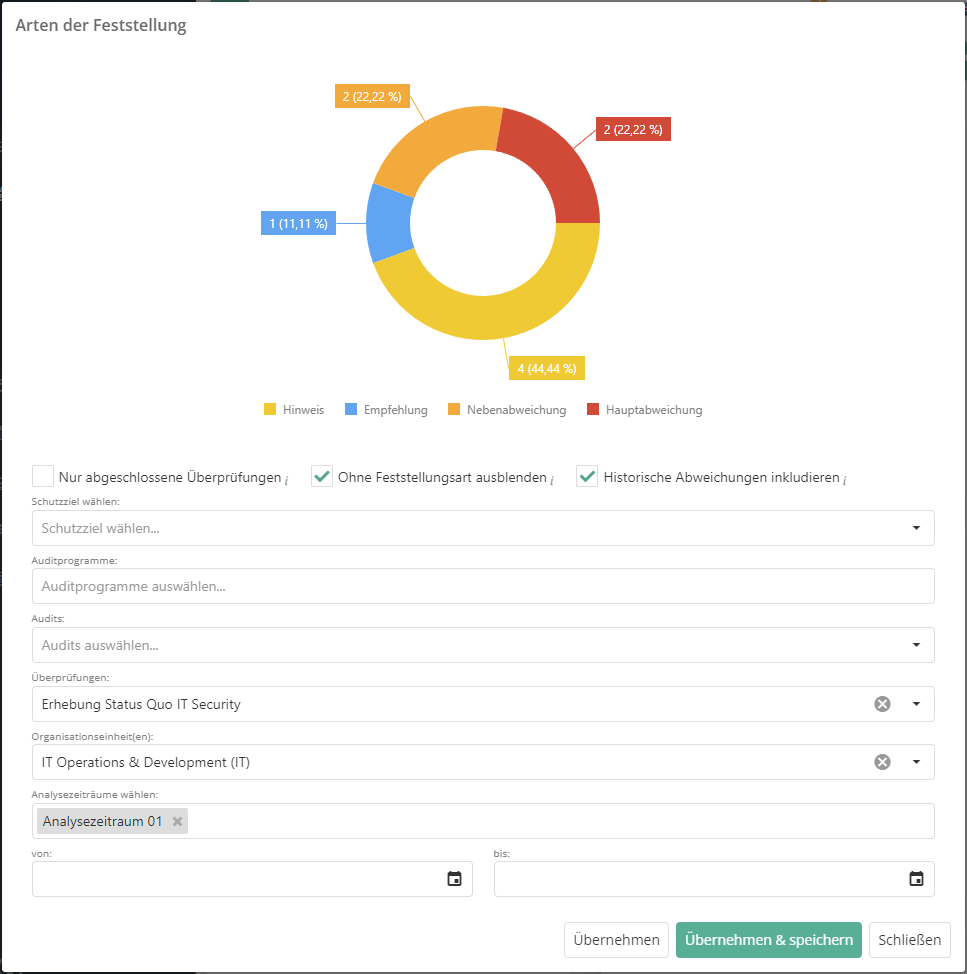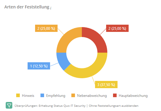 Ist die Feststellungsart bei Überprüfungen im Auditmanagement aktiviert, kann die Anzahl der Hinweise, Empfehlungen, Neben- und Hauptabweichungen in einem Donutdiagramm dargestellt werden. Die Antworten, denen keine der Feststellungsarten zugewiesen wurden, können ein- oder ausgeblendet werden.