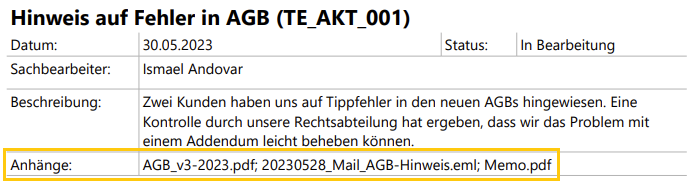 Bei vielen Berichten war es bereits möglich, Anhänge und Evidenzen als Zip-Datei mit dem Bericht herunterzuladen. Dort gibt es nun ebenfalls die neue Option, die Anhänge und Evidenzen auch direkt im Bericht zu inkludieren. Dafür werden im Bericht beim jeweiligen Element, also z.B. bei der Maßnahme oder Akte, die entsprechenden Dateinamen angedruckt.