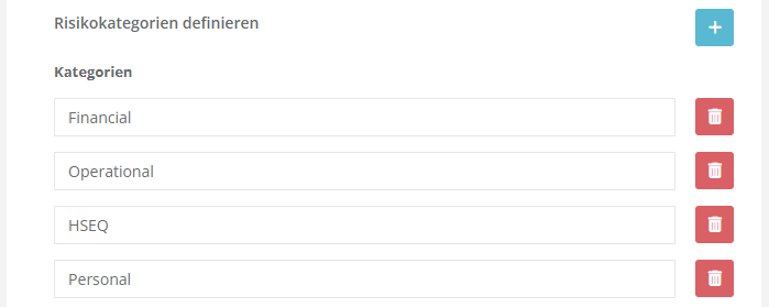 Um die erkannten Risiken gruppieren und damit gezielter auswerten und behandeln zu können, wurde die Möglichkeit eingeführt, unter Risikomanagement > Risikopolitik Risikokategorien zu definieren.