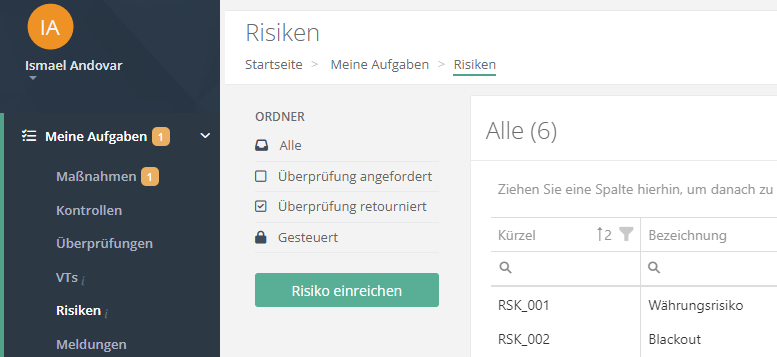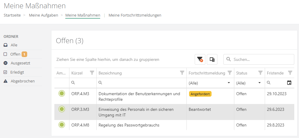 Um eine noch intuitivere Handhabung der Maßnahmen im Bereich Meine Aufgaben zu bieten, haben wir das Practitioner Dashboard für Maßnahmen umgebaut. Beim ersten Klick auf Meine Aufgaben > Maßnahmen findet man jetzt eine Übersicht aller Maßnahmen, für die man als Verantwortlicher eingetragen ist.