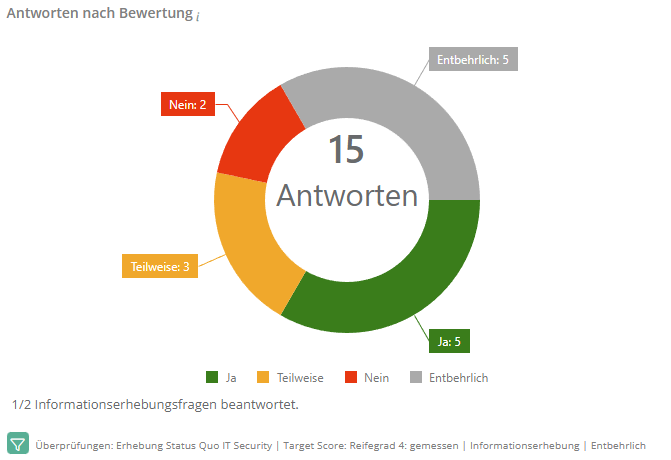 Dieses KPI liefert eine Gesamtübersicht über die Beantwortungen von Prüffragen und Prüfergebnissen. In jeweils einem Donut sieht man die Anzahl der Antworten eines Bewertungsschemas nach ihrer jeweiligen Bewertung gruppiert. Separat kann ausgewiesen werden, ob Informationserhebungen beantwortet wurden (Eine Informationserhebung ist beantwortet, wenn der Kommentar ausgefüllt und/oder eine Evidenz hochgeladen wurde.).