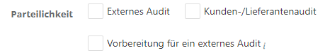 Die Parteilichkeit wurde für Audits und Auditprogramme erweitert. So kann man diese nun nicht mehr ausschließlich als intern oder extern handhaben, sondern optional zusätzlich festhalten, ob es sich dabei um ein Kunden- oder Lieferantenaudit handelt.