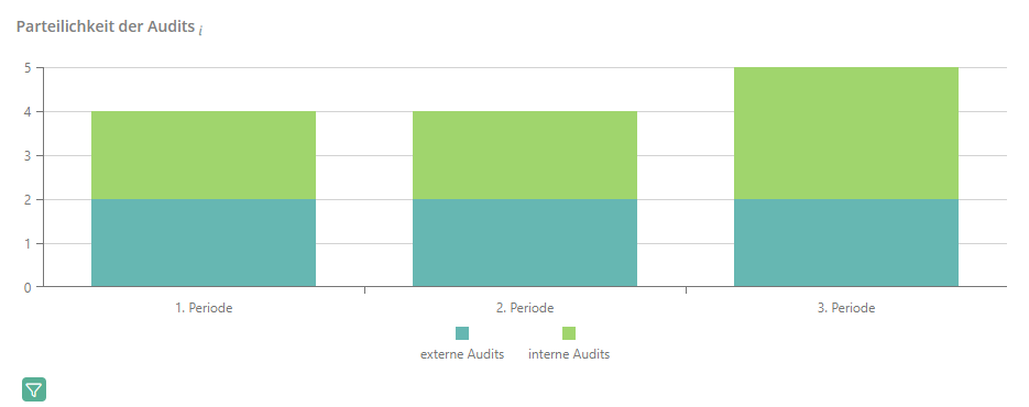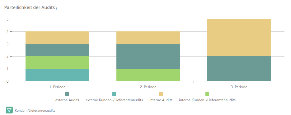 Um vergleichen zu können, welcher Anteil der Auditaktivitäten in jedem Analysezeitraum internen und externen Ursprungs ist, kann die Parteilichkeit der Audits in diesem Balkendiagramm ausgewertet werden. Nur Audits, denen mindestens eine Überprüfung zugewiesen ist, sind einem Analysezeitraum zugewiesen und damit im KPI berücksichtigt.