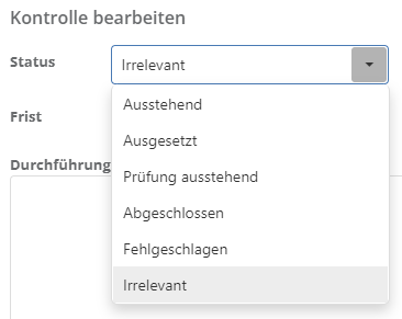 Da sich Kunden immer wieder gewünscht haben, Kontrollen löschen zu können, haben wir die Option eingeführt, eine Kontrolle in den Status „Irrelevant“ zu versetzen. Daraus ergibt sich die weitere Möglichkeit, diese Kontrollen aus KPIs und Berichten auszuschließen, ohne die Revisionssicherheit und Integrität des Tools zu gefährden.