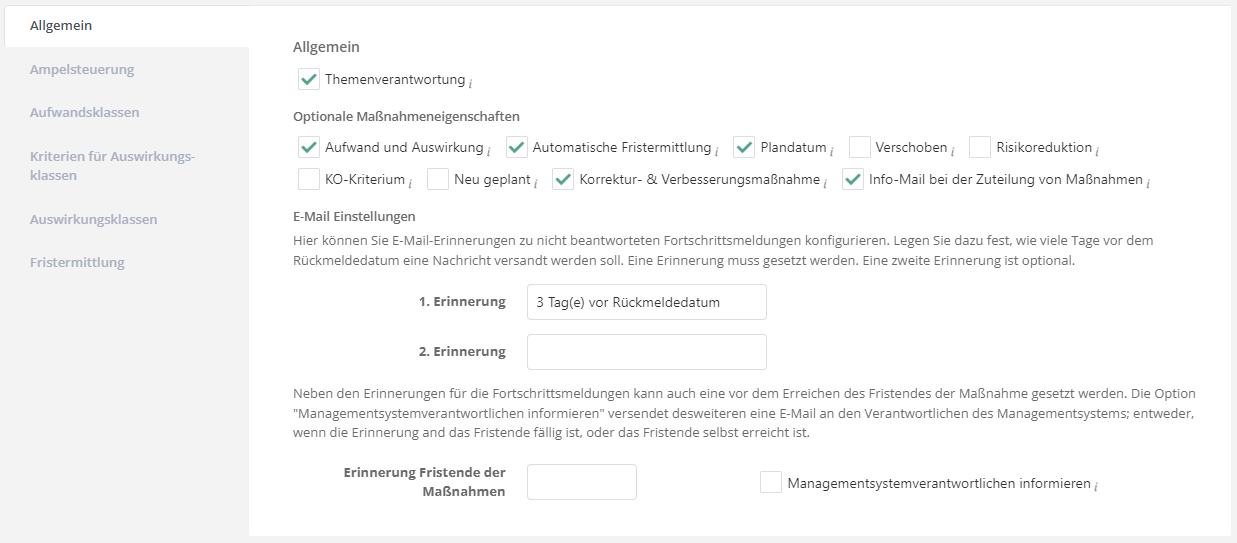 Die Seite Maßnahmen > Einstellungen > Allgemein wurde neustrukturiert, um die Handhabung zu vereinfachen. Die grundlegenden Funktionen sind jedoch unverändert. Die einzige Ausnahme ist die neue Checkbox „Themenverantwortung“ (siehe dazu Kapitel Themenverantwortungen).