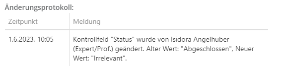 Die Änderung kann von Experts und Professionals in den durchgeführten Kontrollen einer Kontrolldefinition vorgenommen werden und ist im Änderungsprotokoll entsprechend dokumentiert.