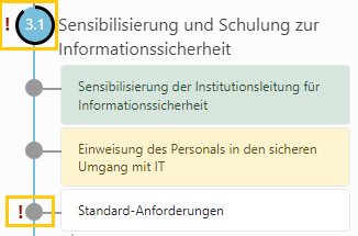 - Abklärungsbedarfe werden bei den einzelnen Prüffragen und dem darüber-liegenden Prüfobjekt mit einem Rufzeichen dargestellt
