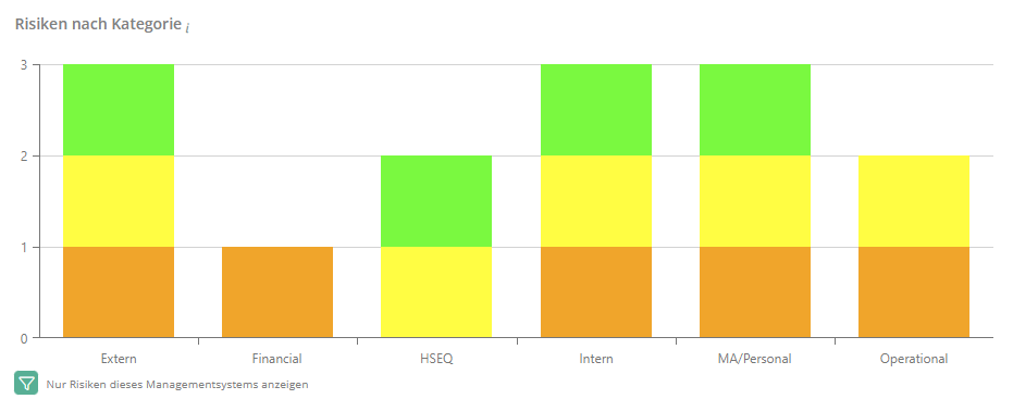 Zur Auswertung der Risikokategorien wurde ein neues KPI in der Sektion Risikomanagement hinzugefügt, in dem die Risiken nach Kategorien gruppiert angezeigt werden. Dementsprechend können Risiken mehrmals im KPI vorkommen: in jeder Kategorie, der sie zugewiesen sind.