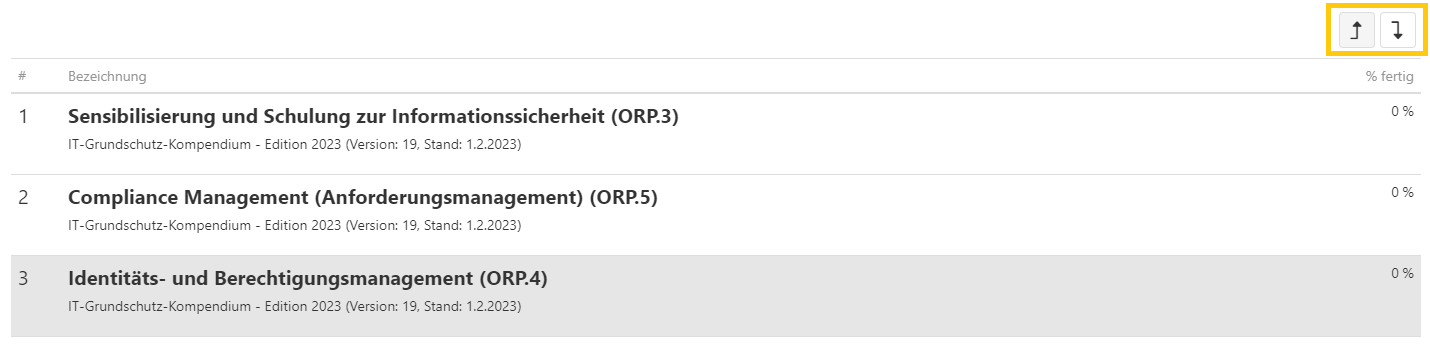 - die Umrandung des Prüfobjekts („3.X“) zeigt die Vollständigkeit der Beantwortung, analog zum Prozentsatz in der Übersicht