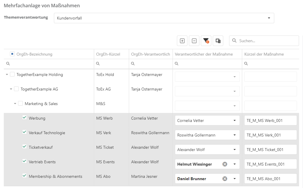 An dieser Stelle kann die Auswahl der selektierten Organisationseinheiten, die zugewiesenen verantwortlichen Personen/Teams sowie die automatisch generierten Kürzel der Maßnahmen auch noch manuell geändert werden.