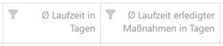 Für alle Maßnahmen, die mit einem Fristbeginn versehen sind, wird die Laufzeit in Tagen errechnet – entweder bis zum aktuellen Tag oder, bei erledigten Maßnahmen, bis zum Erledigt-am Datum. Hier wird pro Organisationseinheit die durchschnittliche Laufzeit all ihrer Maßnahmen dargestellt.