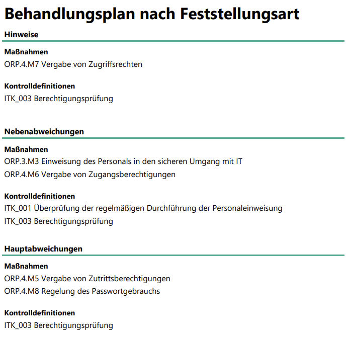 Ist im Auditmanagement die Feststellungsart bei Überprüfungen aktiviert, kann man ausgewählte Berichte um eine Zusammenfassung der erkannten Handlungsbedarfe und deren Priorität ergänzen, indem die Option „Behandlungsplan nach Feststellungsart“ aktiviert wird. In diesem sind alle Maßnahmen und Kontrollen, die einer Haupt- oder Nebenabweichung, einem Hinweis oder einer Empfehlung zugeordnet sind, nach diesen gruppiert aufgelistet.