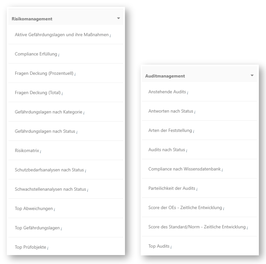 Die Liste der KPIs in der Bearbeitungsansicht der Dashboards wurde in getrennte Sektionen aufgeteilt. Die Risikomanagement-KPIs sind für alle User zugänglich, die im Risikomanagement berechtigt sind. Die Auditmanagement-KPIs sind für alle User zugänglich, die im Auditmanagement berechtigt sind, sofern das Add-on im Managementsystem aktiviert ist. Die KPIs können am Dashboard gemischt verwendet werden.