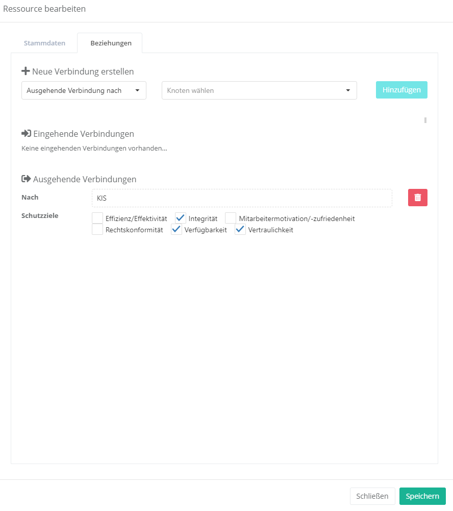 Die Verbindung mit Ressourcen geschieht immer mit Schutzzielen. Diese Schutzziele können aber von Ihnen angepasst werden. Ausnahmen sind Schutzziele, die durch Schutzbedarfsanalysen gewichtet wurden. Diese können nur durch eine neue Schutzbedarfsanalyse verändert werden (zum Erstellen von Schutzzielen siehe Schutzziele), auch wenn sie normal gelöscht werden können.